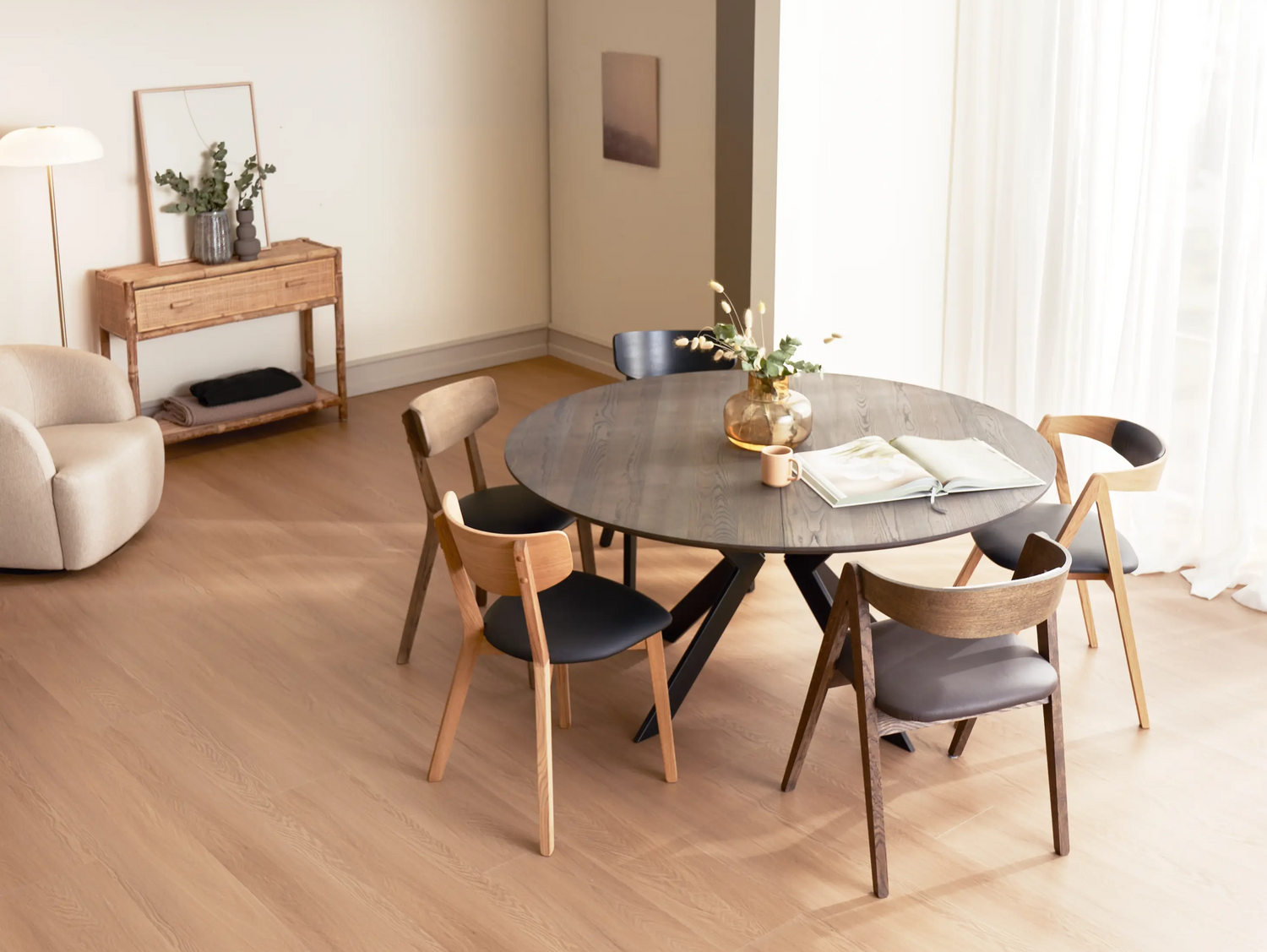 Gulvet er udstyret med en robust 0,70 mm slidlag, der sikrer langvarig modstand mod slid og skrammer. Den naturlige korkbagside bidrager til en behagelig gangkomfort, føles lunere under fødderne og hjælper med at reducere støjniveauet, hvilket skaber en roligere atmosfære.