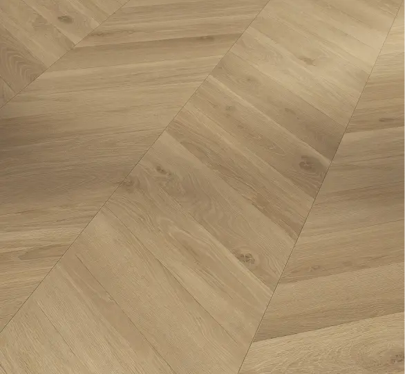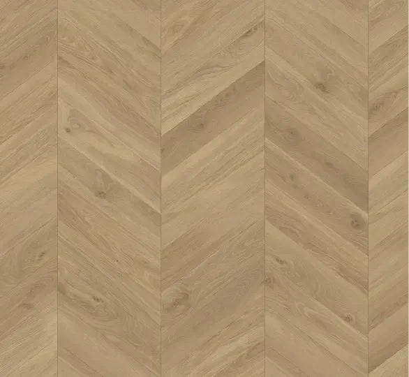 Parador Trendtime 8 - Eg Loire honning silkemat struktur er et eksklusivt laminatgulv, der bringer en tidløs elegance ind i dit hjem. Med sin traditionelle Chevron-optik og silkematte struktur fremstår gulvet som naturligt træ og skaber en rolig, harmonisk atmosfære.