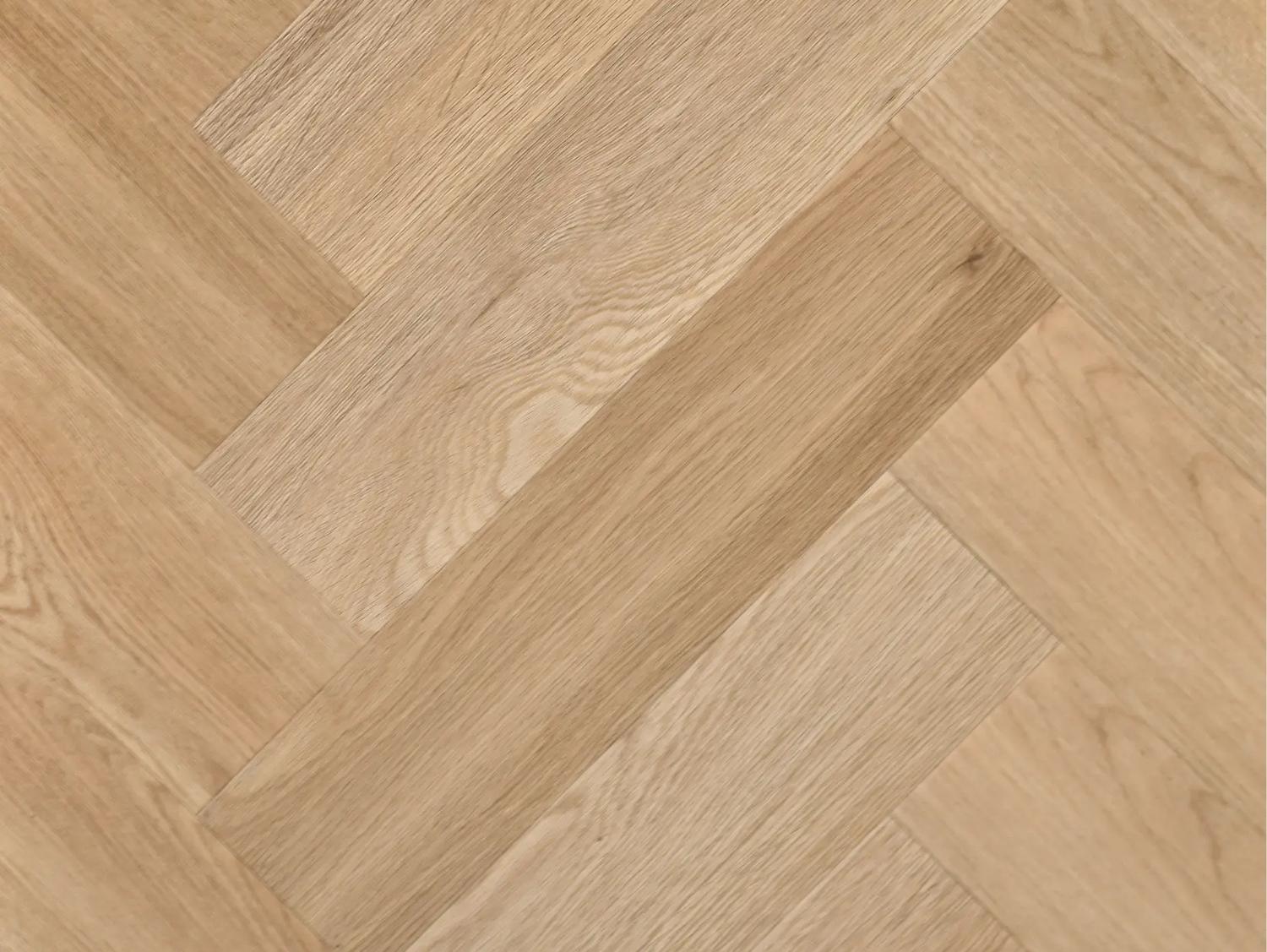 - En elegant sildebensstruktur i en lys egetræsnuance, der skaber et organisk og varmt udtryk.