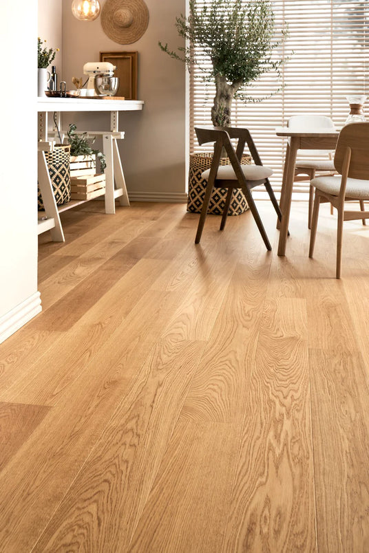 Hold dit plankegulv rent og smukt ved regelmæssigt at feje, støvsuge eller bruge en tør moppe for at fjerne støv, snavs og grus, der kan ridse overfladen. Ved spild, brug en let fugtig klud og rengør området straks for at forhindre pletter eller vandskade. - Undgå vand og fugt
